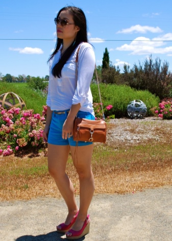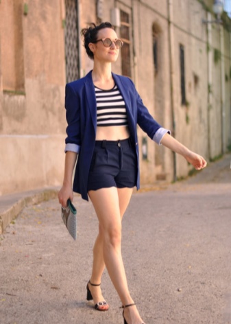 For the office, the combination of light or dark shorts with a jacket is universal. Discreet jewelry, as well as glasses and a handbag in blue or light shades, will help to look gentle and formal at the same time.