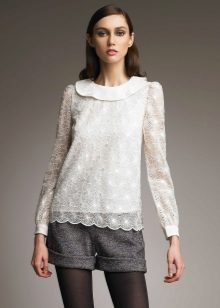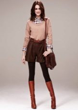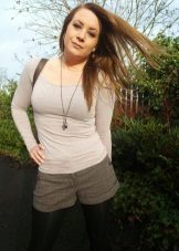 As a top, the shorts are perfectly complemented by a knitted sweater, a cozy cardigan, a tight knitted turtleneck, an interesting blouse. An important point - the sweater should have a length covering the belt of shorts - this will not violate the proportions of the body.