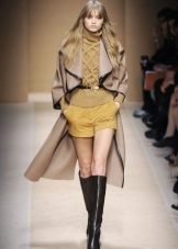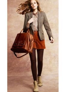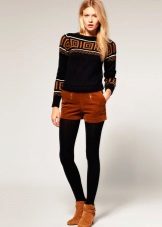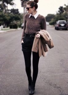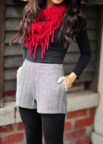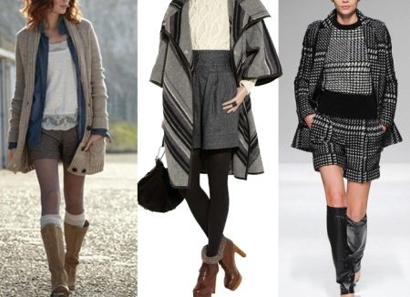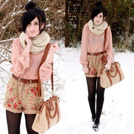 Classic style shorts look harmonious with a jacket or blazer. A fashionable combination is shorts, a turtleneck tucked into shorts with a strap, and a fur vest. It is good to supplement a thin sweater or pullover with a volume knitted snood.