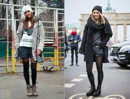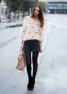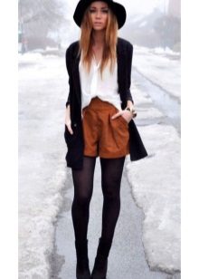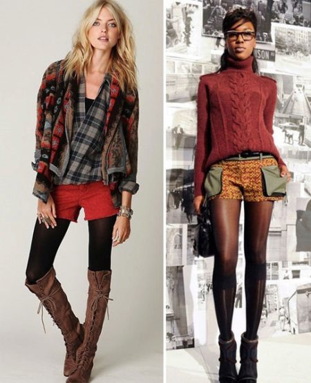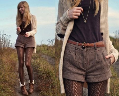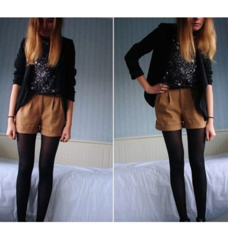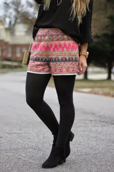 A classic option is a combination of warm shorts with black tights. Moreover, their density depends on the density of the shorts. Wear black denim tights and even wear denim shorts. Interesting look pantyhose with patterns.