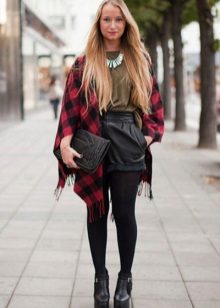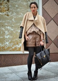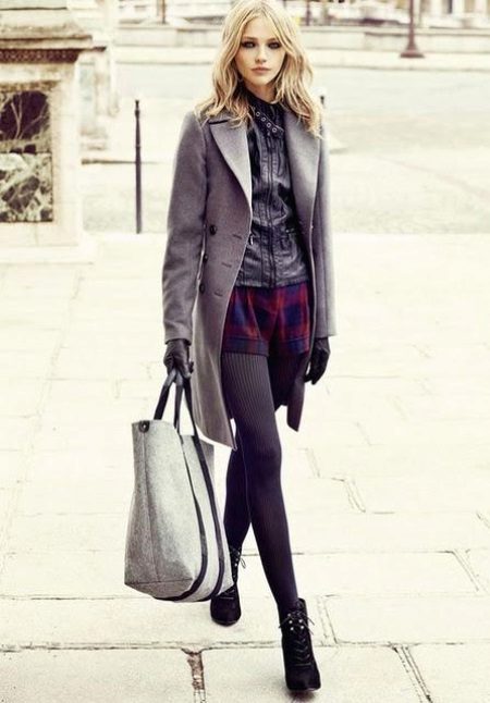 An interesting youth image. Mini-shorts, demonstrating the impeccability of the legs of a blonde girl, are always decorated with an actual print in a large cage (a combination of burgundy and dark blue). The top of the ensemble is original - a stylish blouse made of thin black leather, with which gloves of the same color and material are combined. A coat of classic cut, ribbed tights and a bulk bag are made in different shades of gray. Logically complete the look with suede lace-up heeled ankle boots.