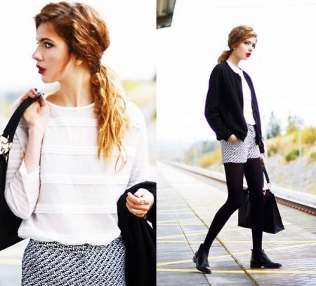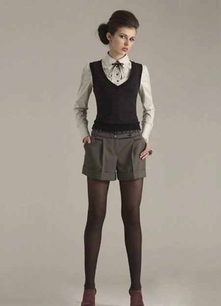 An elegant autumn ensemble may well serve as an option for the office, especially if the girl works in a creative environment. Gray mid-thigh shorts with lapels and charming arrows are complemented by a graceful strap. The top of the ensemble is correctly chosen - a white blouse with a black neckline (buttons and a flirty bow) and a sleek black tight-fitting tank top. Always a win-win classic option - black tights - harmoniously look with suede closed shoes in a beautiful brown shade. The hairstyle of the brunette girl fits perfectly into the business style.