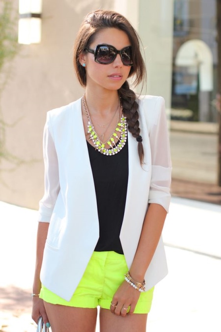The jacket will allow you to create a stylish business image, while there is no need to pick it up to match the shorts.It can be a strict jacket of white, dark blue, gray or black, which can be worn over a top or blouse.