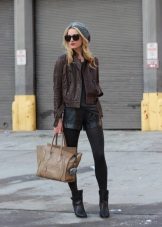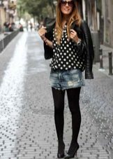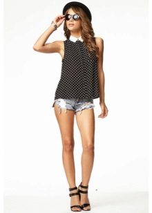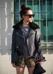 - A stylish combination of denim shorts, a black blouse and a leather jacket. Look is complemented by black narrow-toed boots that visually lengthen the leg. A good image for shopping, a cocktail with friends and a fashionable party.