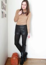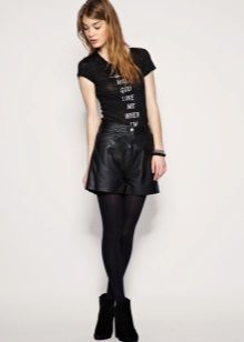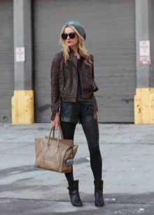 - Wear loose leather shorts with thick black tights in the fall. Complement your look with a terracotta jumper, open-toe ankle boots and a brown tote with a long strap. This image is suitable for everyday wear, meeting friends or even for work if you do not have a strict dress code.