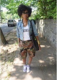 Military style shorts are also called cargo, as are pants of a similar style. Their distinctive features are cut and coloring. Often there are models with patch pockets on the sides. The colors are olive, swamp, gray, sand, khaki and a traditional camouflage print.