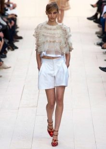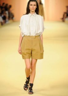 At work, you can wear shorts with a blouse or a thin shirt. It can be bright and or calm, but a white model is always a win-win option. Do not forget to add such an image with accessories and stylish boats.