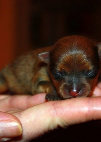 A puppy is born blind, newborn babies open their eyes at the age of two weeks, their hearing appears 2.5 weeks after birth. At the beginning of the second month, small pets have their baby teeth cut out, and therefore they have to buy toys and clean up valuable things. At 2 months, the baby's character traits are laid.