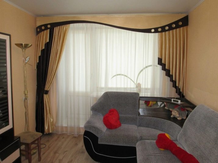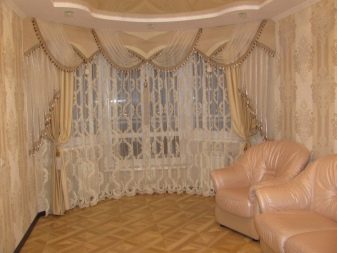 Edges in the corners of the curtains add austerity and creativity to the window decor. Such textiles need to be selected in accordance with the colors of the room. A good option is to buy pillows on a sofa of the same color.