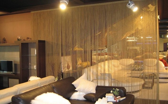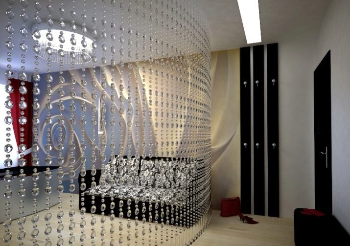 They can be not only from thin flowing threads, but also from beads, plastic jewelry on ropes, etc. The threads themselves look quite bohemian, if transparent beads are strung as elements, they will effectively play in the sun, if wooden - this will give the room ethnic motives. They can be used instead of interior doors.