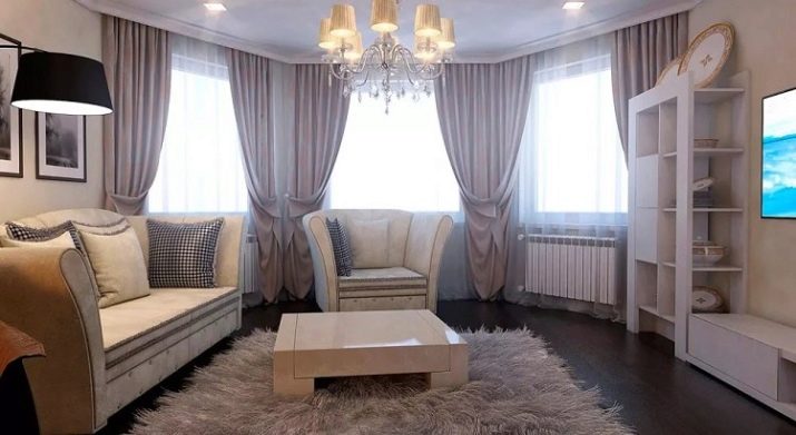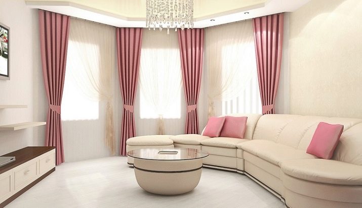 Curtains on the bay window in the living room can be decorated identically on all windows of the ledge. In addition, it is quite possible to arrange them by alternating panels through the window. You can also decorate window openings with canvases of different colors, hung symmetrically.