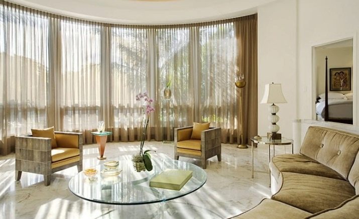 Lambrequin can only be a decoration of the central window. It is recommended to have heavy curtains on each side. In a semicircular bay window, models from a solid transparent tulle or veil look great, fixed by means of a ceiling cornice. Kisei can be designed in a continuous cascade.