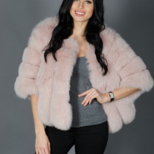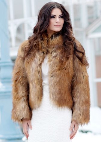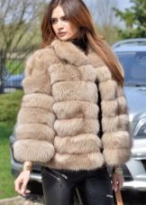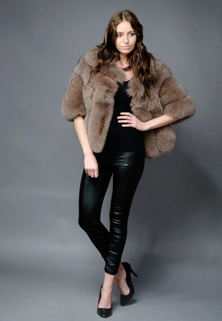 A short fox fur coat of a light brown shade surprisingly harmonizes with the girl's hair color. An interesting model with a wide shortened sleeve from wide transverse fur stripes. Instead of a collar - a beautiful rounded neckline. Under the auto-fur coat, clothes were successfully chosen: tight-fitting black leather pants and the same color as a blouse and shoes. The lack of jewelry is justified, since the focus is on the luxury of fur.