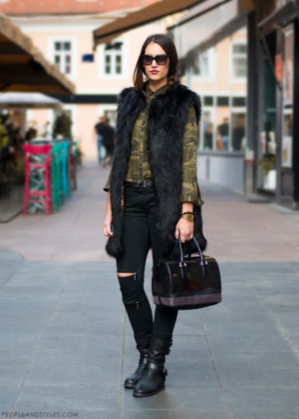 Sleeveless fur coat, also called a sleeveless jacket, goes well with tight trousers and jeans. A loose sweater or turtleneck will suit your outfit. From shoes choose ankle boots or short ankle boots.