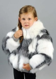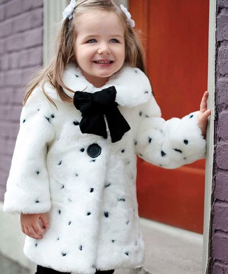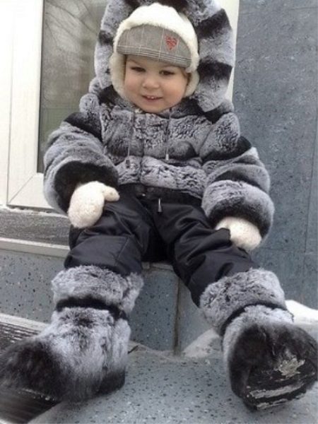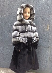 A universal model made of fur from Rex rabbit will suit both a boy and a girl. An unusual color scheme, a transverse cut and a spacious hood that allows you to put on your baby’s favorite hat also make this fur coat a real find for parents who are convinced that their child should not only dress warmly, but also look stylish at the same time.