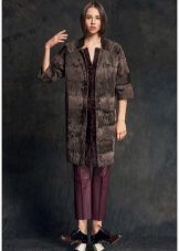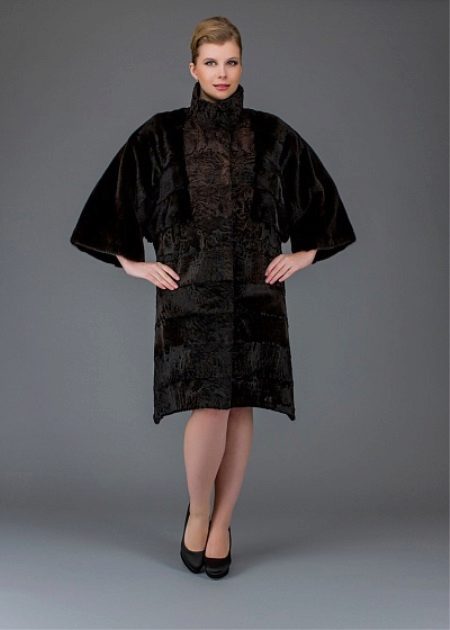 - The original model of a chocolate-colored Karakulchi fur coat combined with mink fur of the same color creates a unique look. A straight free cut model with a stand-up collar and wide sleeves –pipes is perfect for women with curvaceous shapes. The length of the coat to the knees favorably emphasizes the harmony of the legs and stretches the silhouette. The hem of the fur coat seems to be extended along the edges, which gives originality. The highlight of this model is the combination of karakulchi with a mink - the back, part of the front shelf at the sleeves, coat sleeves. In this case, the sleeves seem to go on the front shelves. The visual effect of the mink cape is created. Sleeve length ¾.