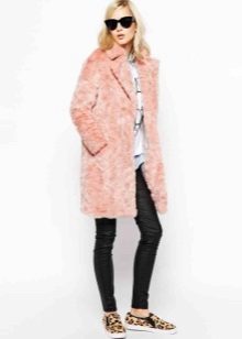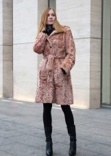 Another self-sufficient option is a long coat of goat painted in unusual pink color with a raccoon finish. Such a fur coat can be safely worn with a short skirt or dress. Round off this look with beige belt and high heel shoes.