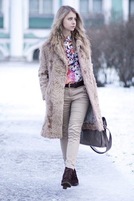 A medium-length beige fur coat not only looks gentle and new, but also allows you to wear light things underneath. A vibrant floral print silk shirt is tucked under beige skinny pants. A bright emphasis is placed on plum shoes. A bag is best to match the tone of a fur coat.