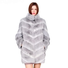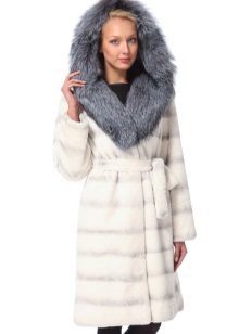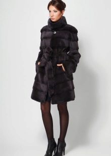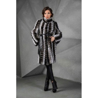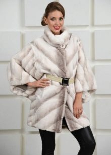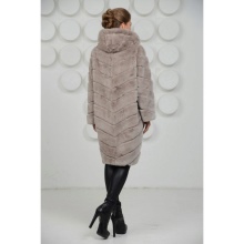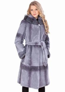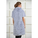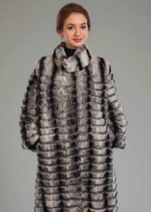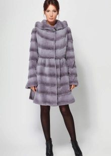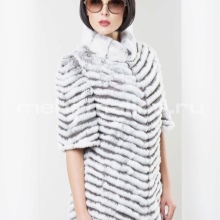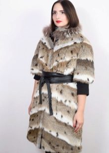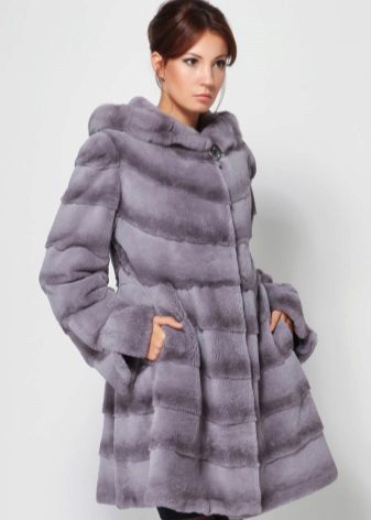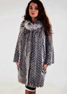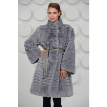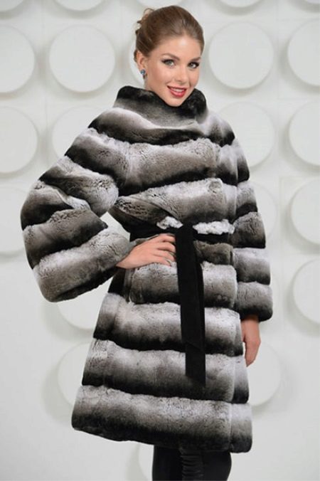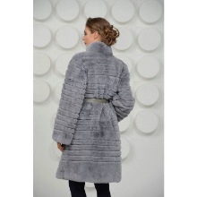 A trapezoidal cross-coat from a Rex rabbit under a chinchilla can be worn with or without a belt. The soft transition of the color of the strips from light gray to black gives the product a special sophistication.