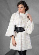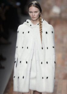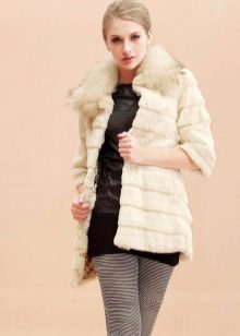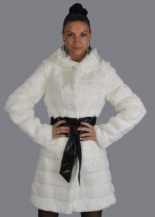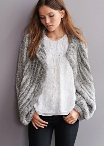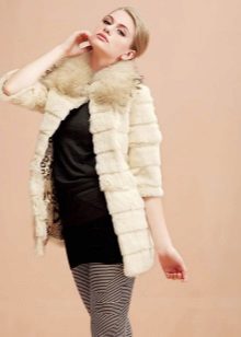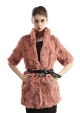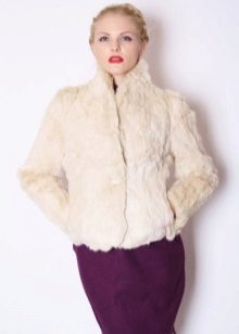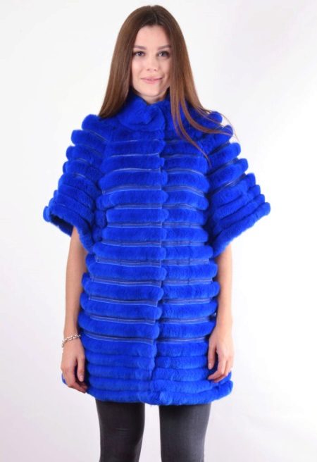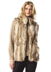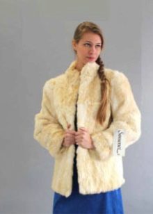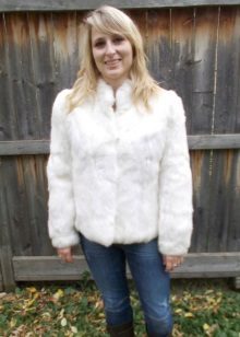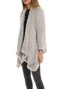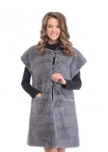 Stylish lightweight fur coats from a rabbit without a collar and with three-quarter sleeves are an exquisite choice, this outfit is suitable for workdays and for special occasions. For trips to the theater or to exhibitions, a cloak, a swinger or a mantle from a rabbit is useful, they are sewn both from whole skins and from pieces. Long vests made of rabbit fur, especially snow-white, are loved by young girls.