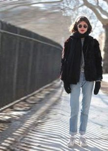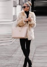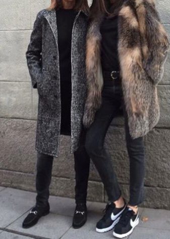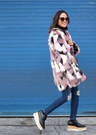 Fur coats of medium length, shortened fur coats and fur jackets look good with narrowed trousers with arrows, skinny jeans, mid-knee skirts and flat shoes, wedges or heels. Sneakers or any other sports shoes are not recommended.