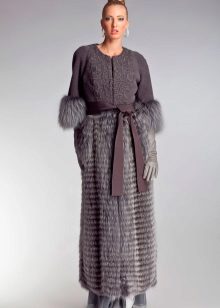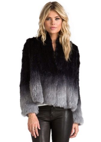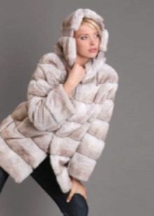 Cross alternation of light and dark fur stripes will appeal to modern fashionistas.The rabbit goes well with leather or suede trim, leather parts can be located at the waist, on the sides or on the sleeves. Knitted parts can replace a hood, a collar, a sleeve completely or its lower part, cuffs, elastic bands at the bottom of the product, pockets or belts.
