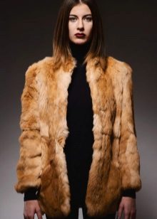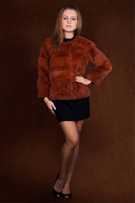 A lightweight rabbit jacket without a collar is sewn from whole pieces of red fur.Such a minimalistic design fur coat not only looks elegant, but also does not constrain movements when driving.