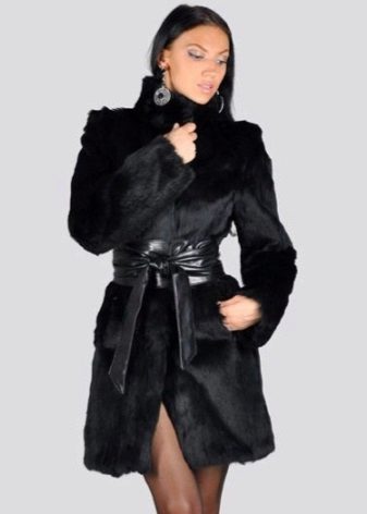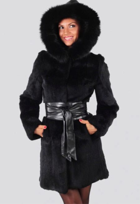 A black fur coat made from whole pieces of rabbit skins looks incredibly light and warm. Sheared fur resembles plush, I just want to stroke it. The comfortable hood is trimmed with fox fur and the waist is intercepted by a wide leather belt.