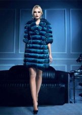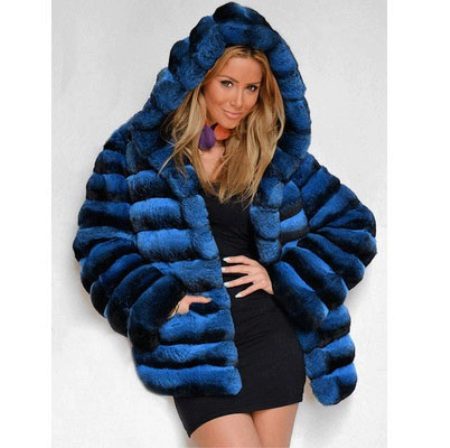 A blue chinchilla coat looks spectacular and stylish. Such an unusual color scheme gives the model expressiveness and uniqueness. A short fur coat with a hood looks great on top of a black dress with a slim fit mini length.