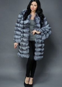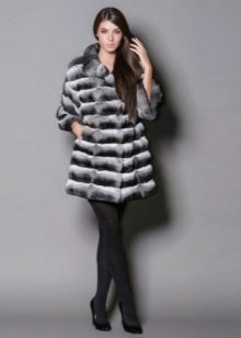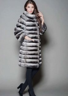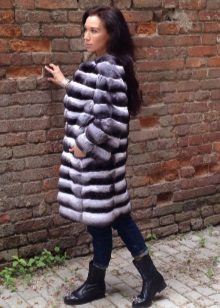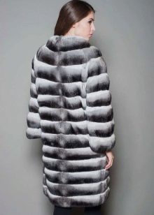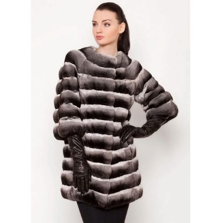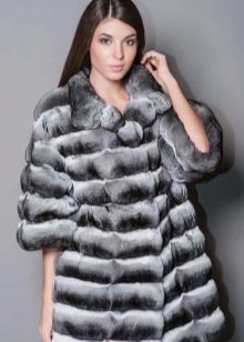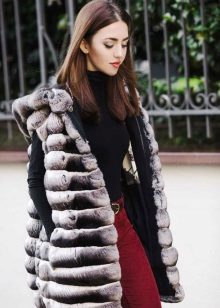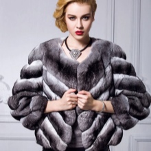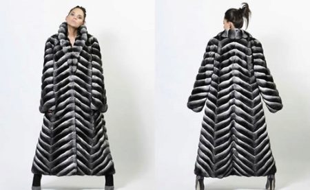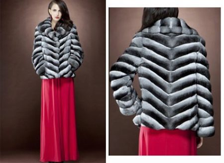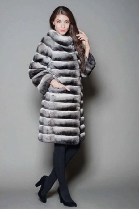 Usually, a chinchilla coat has a simple style, as it can better reveal the beauty of the fur color palette. Chinchilla has a smooth transition from black or blue with a pearl shimmer to white. Designers use this feature and often stitch the skins along, creating luxurious stripes.