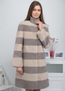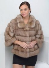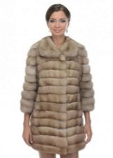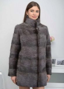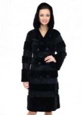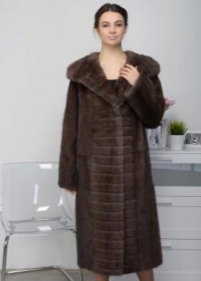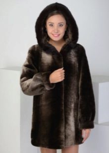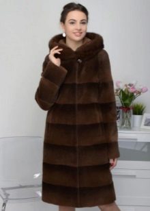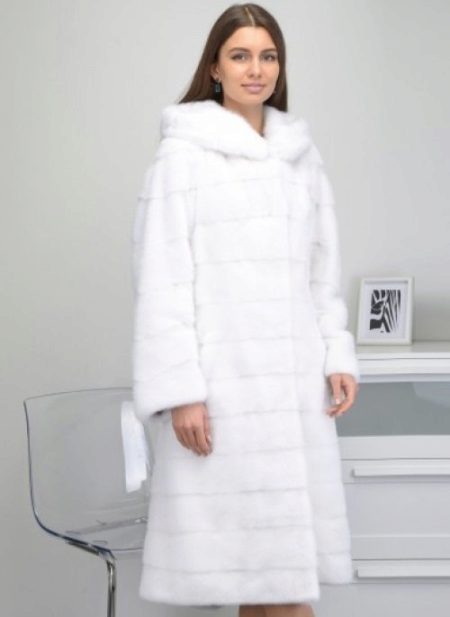 - Shakira - the feminine style of an elongated fur coat from transverse stripes of mink fur, is presented in the catalog of the Kalyaev factory in several colors: white, walnut and pastel. A feature is a classic hood made of the same material;