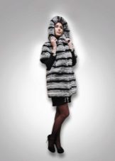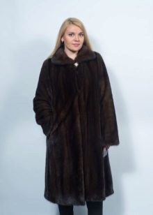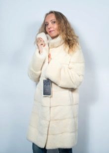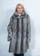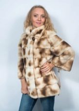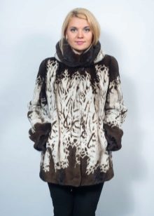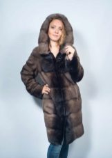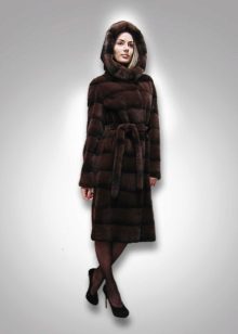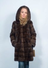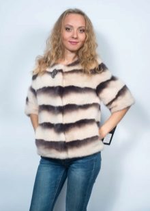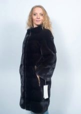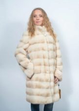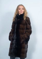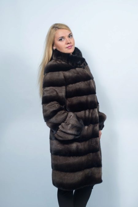 - A beautiful version of the classic straight cut length with a neat stand-up collar. The highlight of the fur coat is its unusual color scheme, based on the alternation of stripes - different shades of brown.Note that this coloring looks advantageous in combination with the blonde hair of the girl. The fur coat is also decorated with an unusual style of sleeves - a flashlight below.
