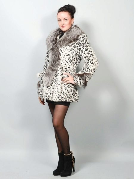 - A spectacular short fur coat made of beaver trimmed with a chic fox collar. This element of decor is also present on the sleeves. Exotic spotty coloring is perfect for a young, confident girl. The model’s style emphasizes the slim waist of the girl, and the short length in combination with a mini skirt reveals beautiful legs. White trim high-heeled ankle boots echoes the background color of a fur coat.