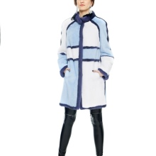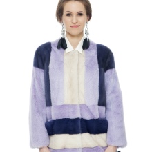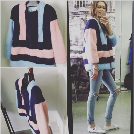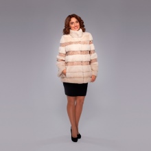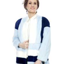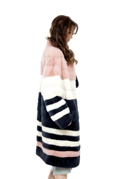 The mink coat is made using a transverse design and ideally combines strips of pale pink, white and blue-black. Thanks to this combination, this model becomes the most suitable for young girls and simply talented personalities who like to stand out from the crowd with very extravagant wardrobe elements. Direct cut and the absence of a hood makes this model of a fur coat the most practical. She will fit well into feminine and semi-sports, urban styles.