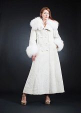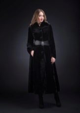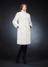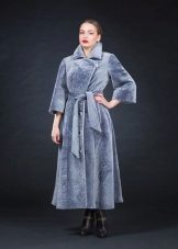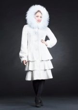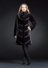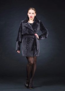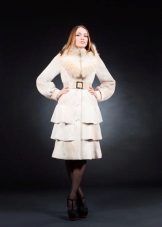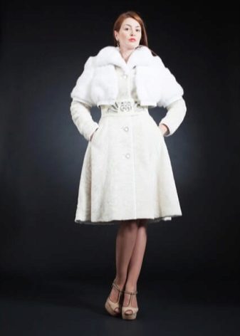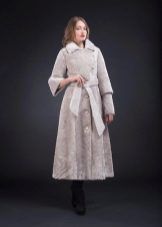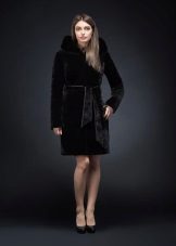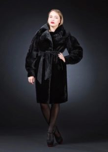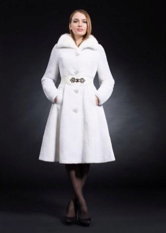 A very romantic model of a fur coat made of mouton is made in a snow-white color. The chip of the model is the flared hem of the “sun” coat, which makes the model very feminine. The collar is turn-down, trimmed with white mink, the sleeve is long classic, the length of the fur coat is below the knees, a spectacular belt emphasizes the slimness of the waist. The cuffs of the sleeves are decorated with a hem; pockets on the fur coat add practicality. In addition to this model of a fur coat from a muton, you can buy a fur bolero or a white mink vest, which is worn over the fur coat. The image immediately becomes elegant and chic.