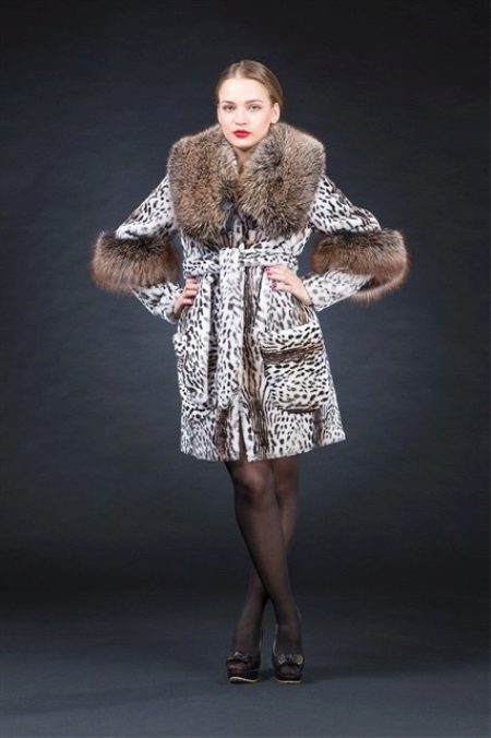 A fur coat from a muton of an unusual color imitating the spots of a jaguar will become a favorite thing for many young girls.A model of comfortable length to the middle of the thigh, a long sleeve with an insert of dark mink, a comfortable and voluminous hood, is also trimmed with mink fur. Mink inserts in the form of a wide strip on the sleeves with an irregular arrangement - just above the wrists, attract attention.