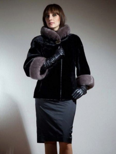 A great model for everyday wear of a business and confident woman. The model is up to the middle of the thigh of a straight cut, black with a shortened sleeve, a wide stand-up collar. The main “highlight” of this model is the smoky mink finish of the collar and cuffs of the sleeves in the form of a wide strip. The color combination emphasizes the nobility and elegance of the model. The edges of the fur coat are decorated with a thin edging of black leather. The top clasp of the fur coat at the collar is made on a spectacular large button. This model must be worn with long gloves.