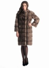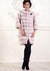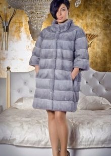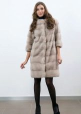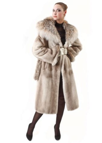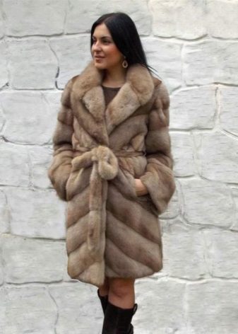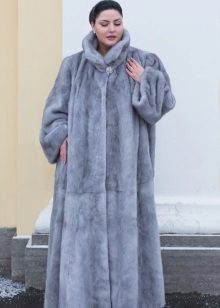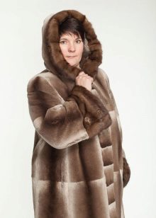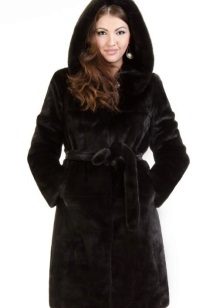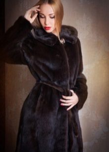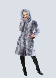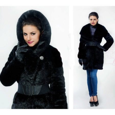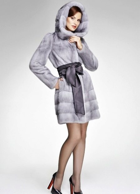 A spectacular mink model with a fitted silhouette and a belt that highlights the waist. The main decoration here is the rich texture of the fur, its noble light color, which in each strip passes from a light shade to a little dark. A free hood also adorns the owner of such a furry miracle, and warms in severe frosts, allowing you to do without a headdress. A wide gray belt demonstrates the successful combination of a light mink with gray accessories.