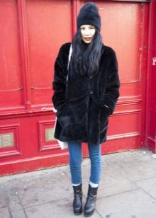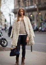 - A long fur coat made of long fur is a small case when jeans, a knitted headdress and massive shoes will be more appropriate than classic clothes.