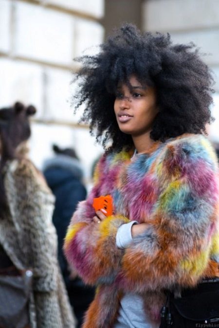 And here is a bright representative of youth fur fashion. Bright pieces of the most unexpected colors create a single model that will look fresh, relevant and catchy on any girl. And what else is needed at this age: to be brighter than anyone, to surprise the world and fully express your personality, even if at the expense of a short fur coat. As we said earlier, with such a bright fur coat it is necessary to wear the simplest things: black trousers and a bag, a light jacket, natural makeup.