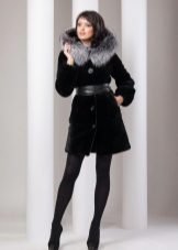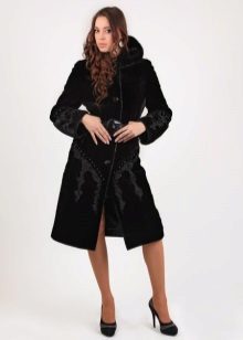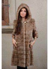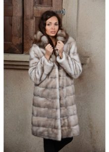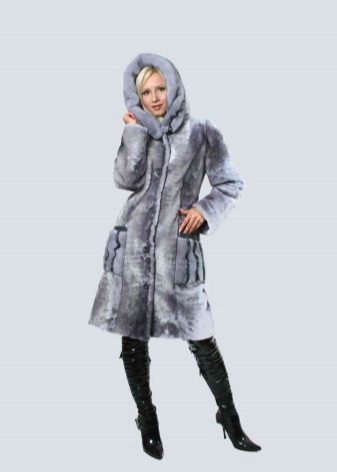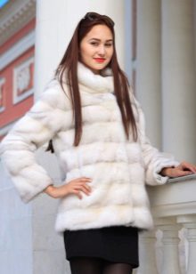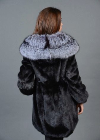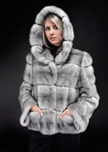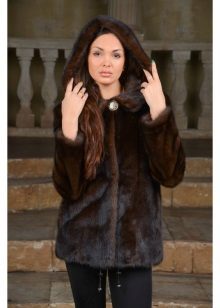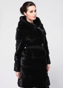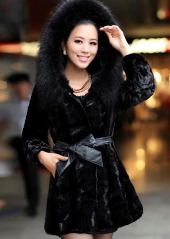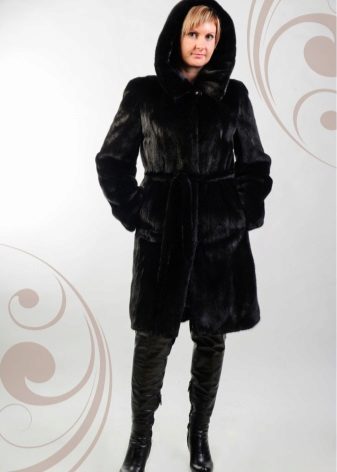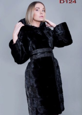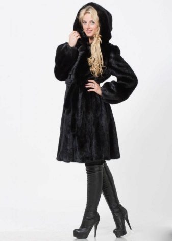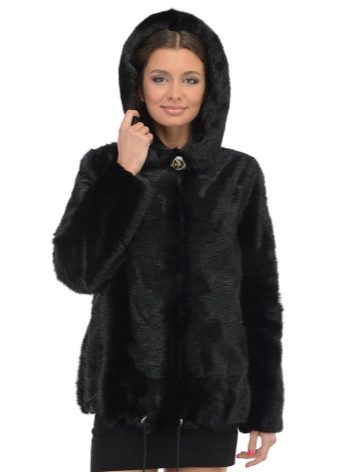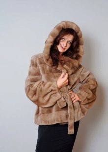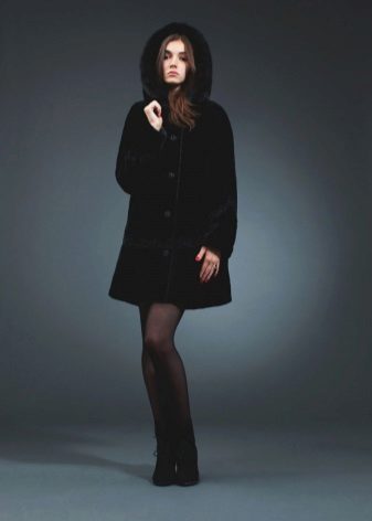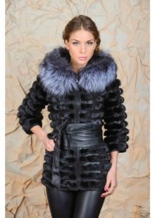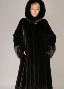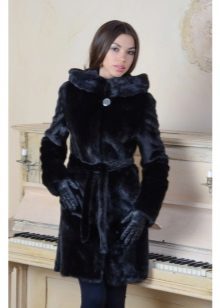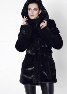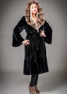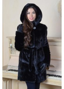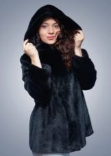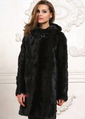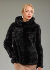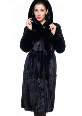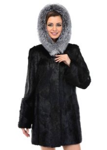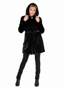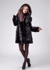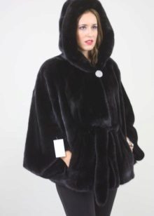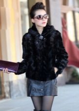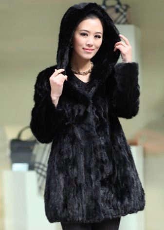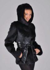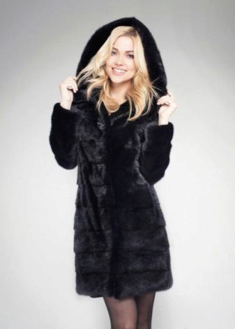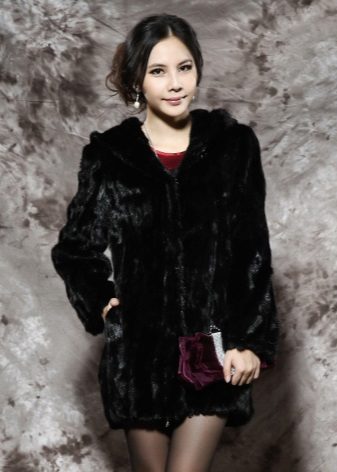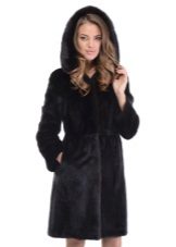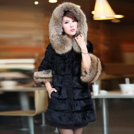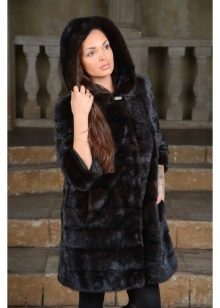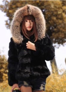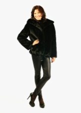 - The transverse black fur coat, in the Chanel style, has a length covering the buttocks, as well as shortened sleeves - 3 \ 4. The cuffs of the sleeves, as well as the edge of the hood, are trimmed with fluffy palomino fur, which gives the product a certain charm. In view of the special style of the sleeves, you should get warm elongated gloves. And in order not to freeze, we recommend combining this model with a trouser bottom or warm, dense tights. Since the fur coat has a luxurious elegant look, you should choose models of shoes with heels.