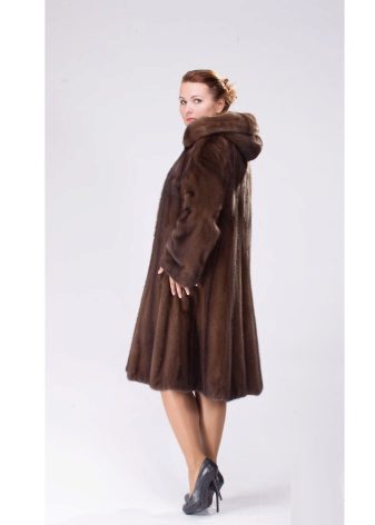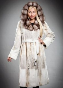 - Sheared mink fur coat has an animal print on a white background and is supplemented with pieces of brown fur in the inside of the hood and sleeve area. This product is a fur coat - a bathrobe, which is complemented by a belt from the same fur. The length of the midi gives the product an incredibly luxurious and feminine look, and in combination with high leather boots with heels, the image will turn out to be royal chic. This model of a fur coat can be combined with both skirts and trousers.