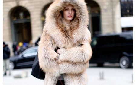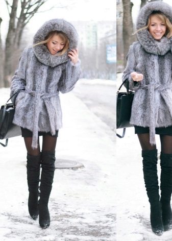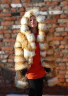 - A fluffy fox fur coat with a large hood will be an excellent option for residents of cities and countries with frosty climatic conditions. The model, up to the middle of the thigh, will perfectly combine with both a trouser and a skirt hem. The product is incredibly warm, so it does not need to be supplemented with a thick knitted sweater, which means that you can pick up any blouse. As shoes, both heeled and flat models are suitable, including winter boots, fur boots and cute uggs.
