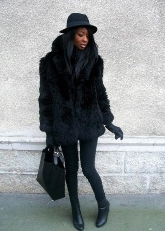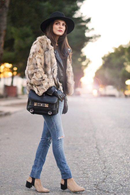 Trousers and jeans of various models are perfect for shortened fur coats, but you should be careful with shoes. The combination of flared and straight trousers is not appropriate for shoes with flat soles, and allows only a model with heels, while skinny jeans are perfect for uggs or boots.