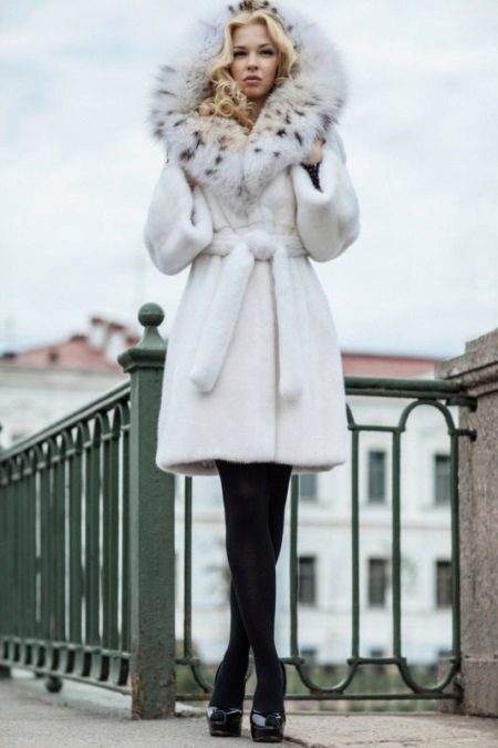 - A white short-haired fur coat is knee-length and will look great with a dress or skirt and tight black tights. This fur coat has a large hood with fluffy fur trim with a light spotty print. If you are going to an event, and you have to, just gracefully get out of the car, you can wear smart high-heeled shoes. But for long walks on the street, we advise you to purchase a pair of stylish boots.