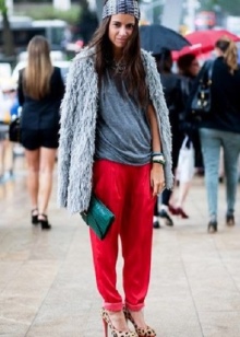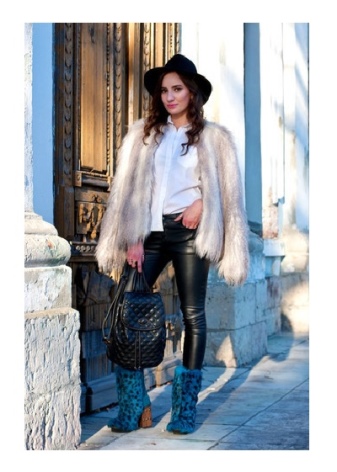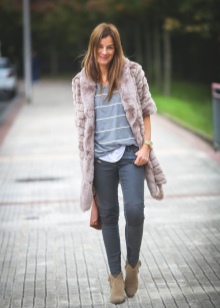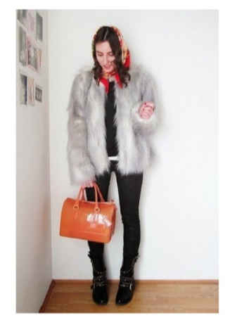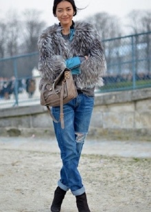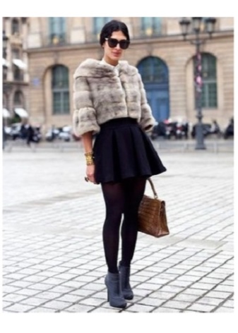 When combining fur coats with skirts or dresses, it is better to wear black tights. As for the shoes, cropped high-heeled boots, winter-type ankle boots with medium heels, bold boots, half boots are suitable for gray fur coats. Depending on the shade, the color of the shoe can be black, burgundy, navy blue and brown.