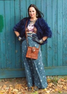 A luxurious bohemian look made up of blue things. Total blue looks great when it combines rich materials such as fur and silk. Black shoes are not knocked out of the general color scheme, as the fur coat is slightly blackened. This option will be a good alternative to a festive dress for an evening out.