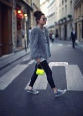 A bold and freedom-saturated image, the basis of which is formed by a fur coat made of mechalam. A simple gray jumper, classic jeans with an open ankle and an elegant bright handbag on a chain. Yes, to combine a bag thrown over his shoulder and a fur coat made of fur is against the rules.But in this case, look itself is conceived as a stylish rebellion against the system!