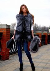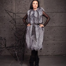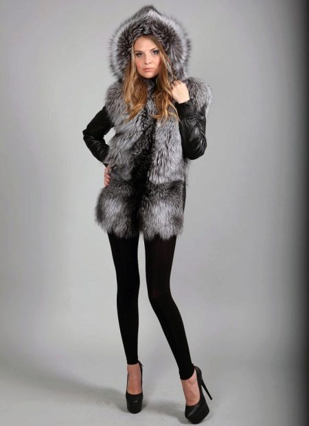 A bold fur coat-vest, combining the nobility of silver fox fur and the restrained luxury of genuine leather, of which not only removable sleeves are made, but also vertical inserts on the sides of the vest. A spacious hood does not create a feeling of bulkyness - it literally streams on the girl's head, making a favorable emphasis on a light shade of hair. Wearing along with black leggings, this transformer vest looks great both with leather sleeves and without them.