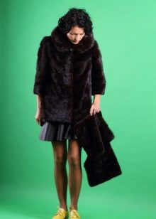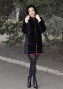 The fitted mink fur coat with a secret: the sleeves and hem of this model are easily shortened, making it possible to make an elongated fur coat, in which any cold is not terrible, into a light demi-season outfit. The elegant hood eliminates the need to choose a hat for the luxurious fur, so the only addition to the already spectacular look will be graceful black shoes, emphasizing the slimness of the legs and tall girl.